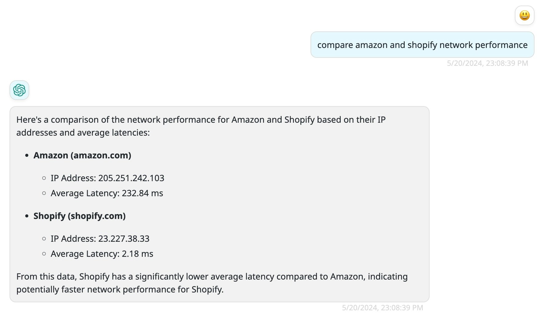 Next, your serverless will be deployed to Vivgrid Geo-distributed Network, it will be available in multiple regions, and the requests will be routed to the nearest region by Vivgrid Geo-distributed Network.At first, create a file named then run:Once Deployed, monitor real-time logs and ask the question “Compare amazon and shopify network performance” again:Your AI Agent can now answer the question with network performance comparison: